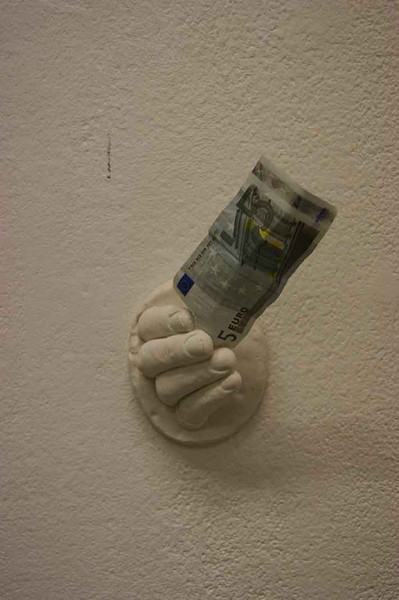 Auseinandersetzung mit den haptischen und ästhetischen Qualitäten von Geld; hier von 5-Euro Schein-Noten. Dabei spielt inhaltlich zum einen der Aspekt des „Erinnerns/Gedenken“ und zum anderen der