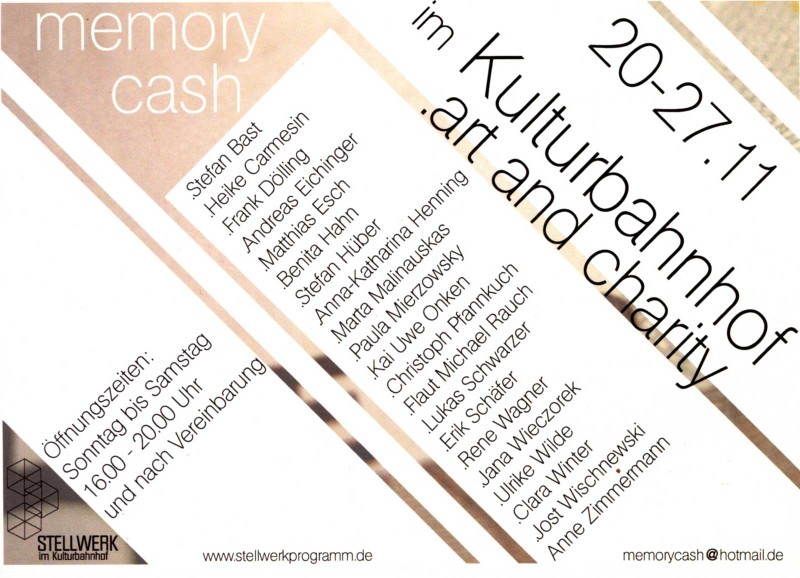 „Kunst wird zu Geld“ und „Geld wird zu Kunst“ – das steht im Zentrum der Ausstellung „Memory_Cash“, zu sehen vom 20. bis 27. November 2010 im Stellwerk im Kulturbahnhof Kassel. Dabei spielt zum einen der Aspekt des Gedenkens und zum anderen das Gedächtnisspiel „Memory” eine Rolle. Erinnert werden soll an den im Sommer verstorbenen Künstler und Professor Stefan Demary, der die Leitung der Basisklasse an der Kunsthochschule Kassel inne hatte, und an den kürzlich verstorbenen Künstler Christoph Schlingensief, der als einer der genialsten Köpfe des deutschen „Kunst- und Theater-Zirkus“ gelten darf. Pressetext HBK-Kassel->