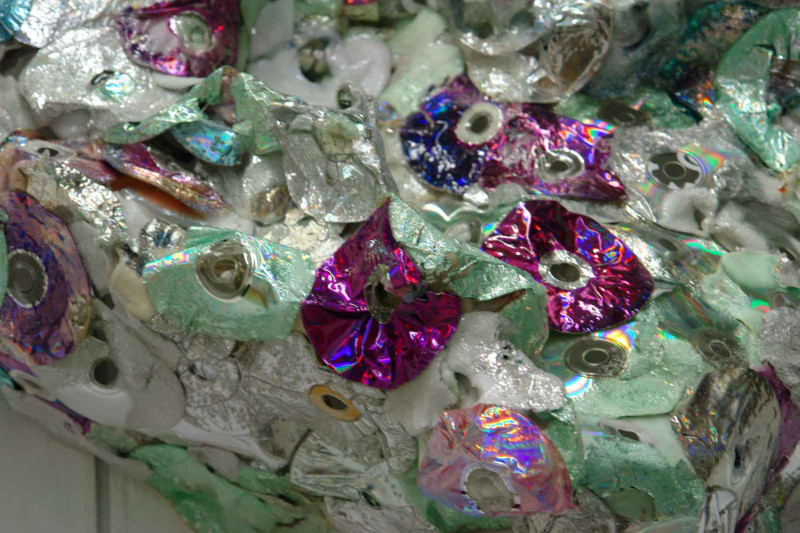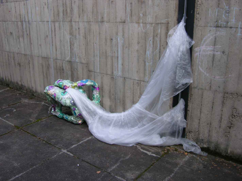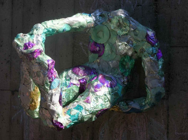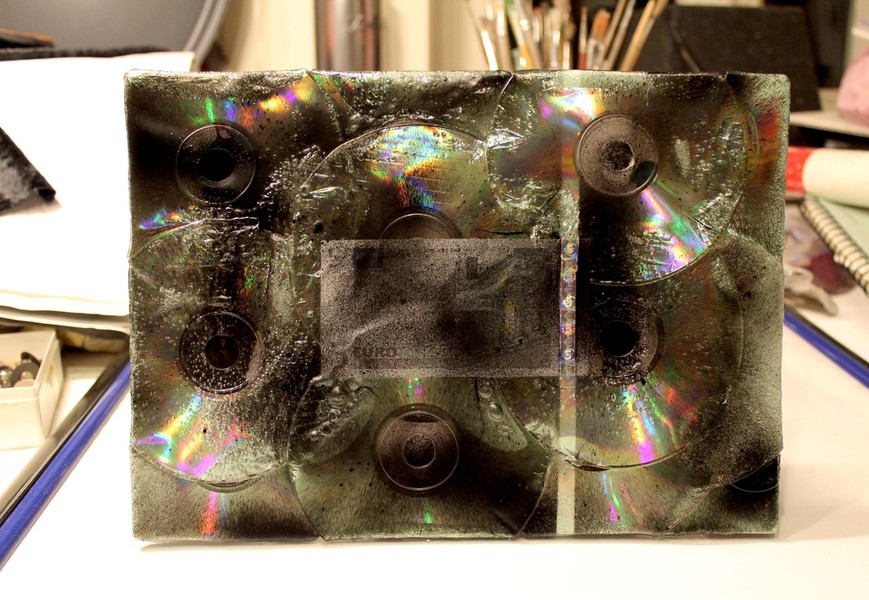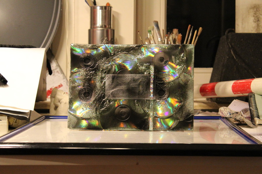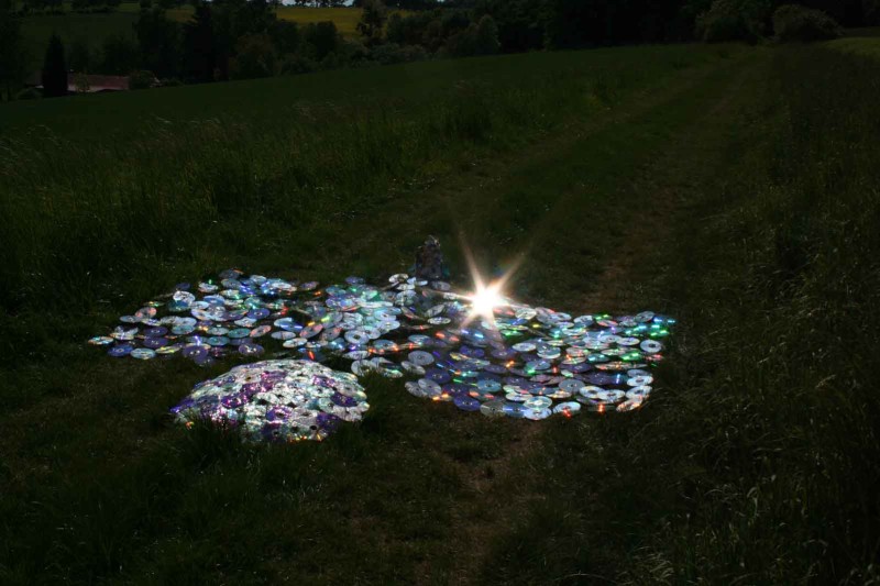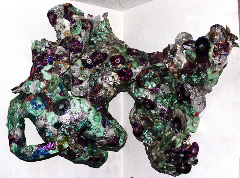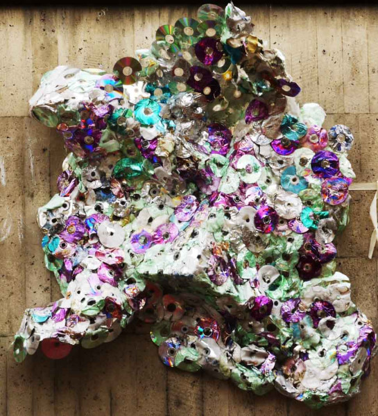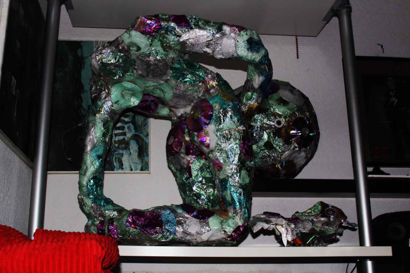 Ein weiblicher Torso der verrenkt bis deformiert erscheint, geformt aus Datenträgern, welche ein ähnliches Schicksal erleiden mussten.